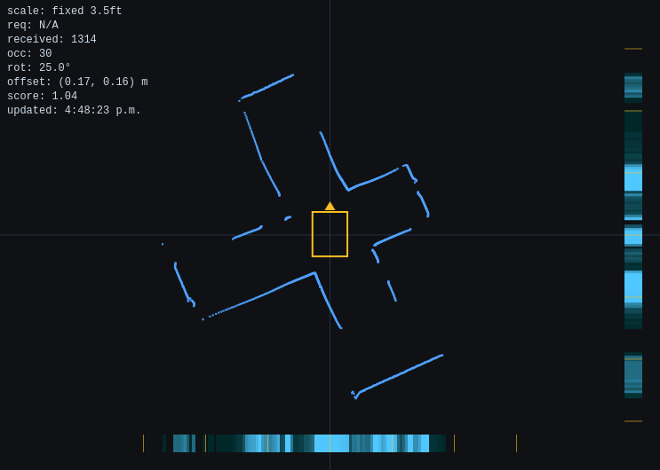 Single-bin Fourier transform detects 1 ft grid periodicity in projected LIDAR points. Magnitude indicates alignment quality, phase encodes offset.
