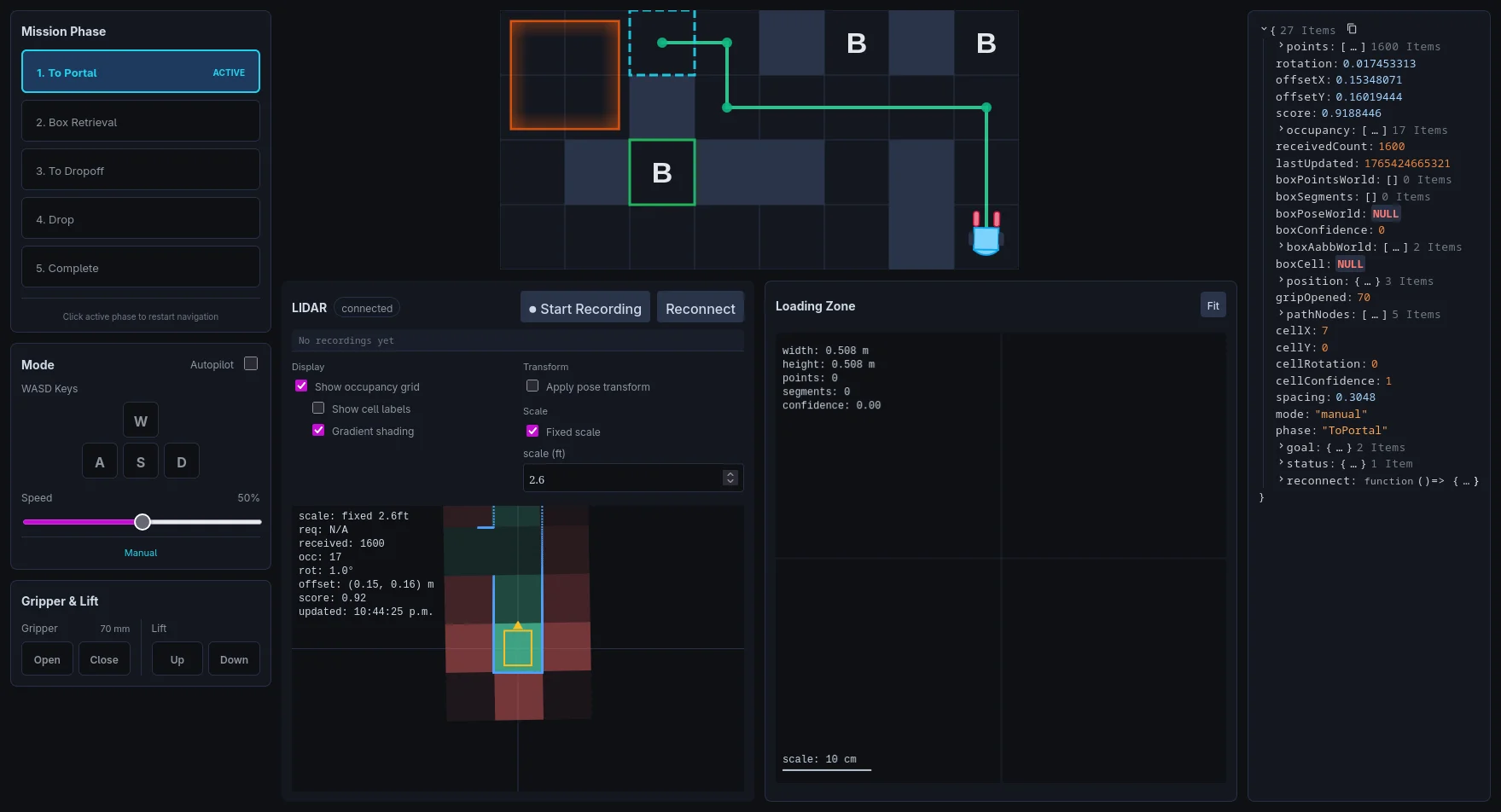 - 600 ms staleness timeout pauses navigation if LIDAR fails